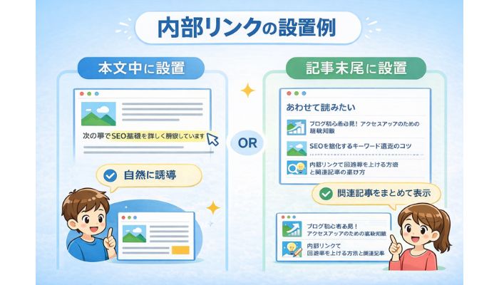 内部リンクを適切に設置することで、読者の滞在時間が増え、SEO評価も向上します。
